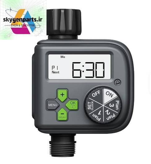 این تایمر دیجیتال برای نصب بر روی شیر آب باغ یا لوله آبیاری است، با یک خروجی (Outlet) برای وصل شدن به شلنگ یا سیستم آبیاری قطرهای.